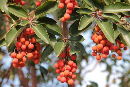 Fruit: Fruit are red berry-like drupes borne in a tight cluster.